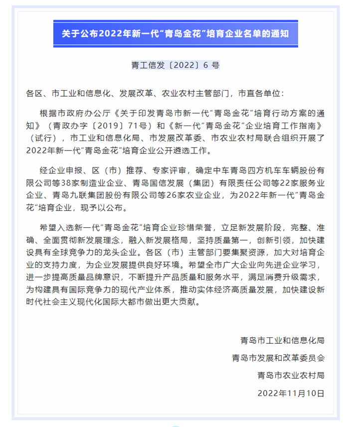 近日,從市工業(yè)和信息化局獲悉,青島明月海藻集團(tuán)榮獲2022年新一代“青島金花”培育企業(yè)稱號(hào),這是我集團(tuán)連續(xù)四年獲此殊榮。據(jù)悉,該項(xiàng)榮譽(yù)由市工業(yè)和信息化局牽頭遴選,旨在遴選一批在行業(yè)中具有明顯規(guī)模優(yōu)勢(shì)和競(jìng)爭(zhēng)優(yōu)勢(shì)、擁有高品牌知名度和品牌價(jià)值的企業(yè),充分發(fā)揮企業(yè)的品牌影響力和主體作用,促進(jìn)企業(yè)做大做強(qiáng),推進(jìn)產(chǎn)業(yè)創(chuàng)新發(fā)展。