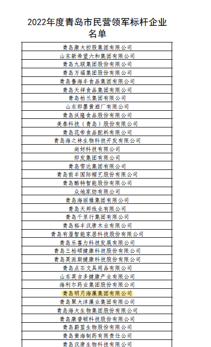 日前,青島市民營經濟(中小企業)發展工作領導小組辦公室公布了2022年度青島市民營領軍標桿企業名單,這是青島首次評選民營領軍標桿企業。青島明月海藻集團光榮上榜,成為“2022年度青島市民營領軍標桿企業”。