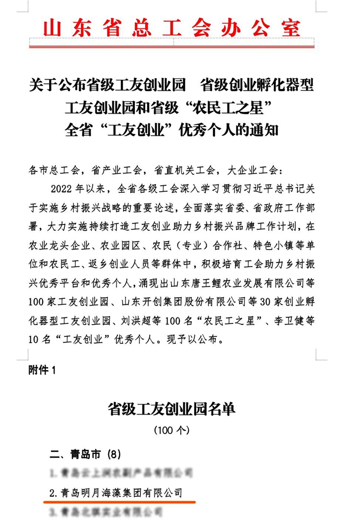 近日,山東省總工會(huì)下發(fā)《關(guān)于公布省級(jí)工友創(chuàng)業(yè)園、省級(jí)創(chuàng)業(yè)孵化器型工友創(chuàng)業(yè)園、省級(jí)“農(nóng)民工之星”和全省“工友創(chuàng)業(yè)”優(yōu)秀個(gè)人的通知》,青島明月海藻集團(tuán)成功入選省級(jí)工友創(chuàng)業(yè)園。