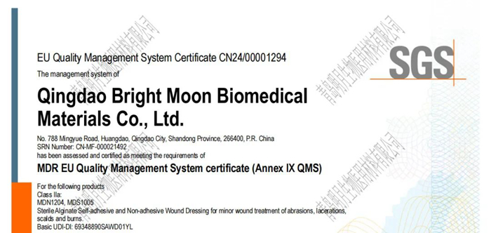 近日,青島明月生物醫(yī)用材料有限公司的代表產(chǎn)品“藻酸鹽無菌傷口敷料”獲得通標(biāo)標(biāo)準(zhǔn)技術(shù)服務(wù)有限公司(以下簡稱“SGS”)簽發(fā)的歐盟MDR證書,這是醫(yī)用材料獲得的第一張歐盟MDR證書,也是SGS在藻酸鹽敷料領(lǐng)域頒發(fā)的第一張無源ⅡA類醫(yī)療器械MDR證書。