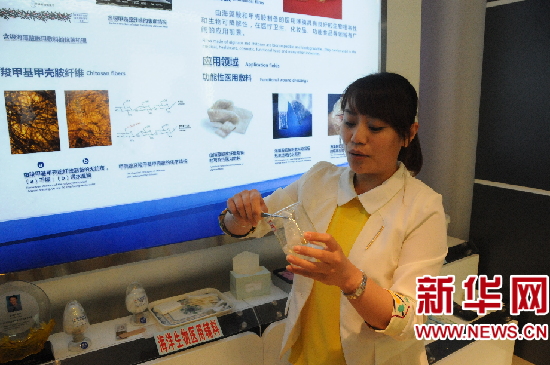 明月海藻集團工作人員展示“無紡布”的特殊功效