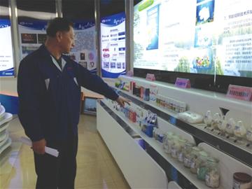 明月海藻工作人員向記者介紹海藻衍生產(chǎn)品