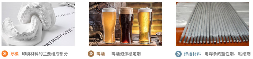 乳白色至淺黃色粉末或顆粒,良好的親水性、流動性、增稠性、凝膠性,相同條件下其強度優于海藻酸鈉。