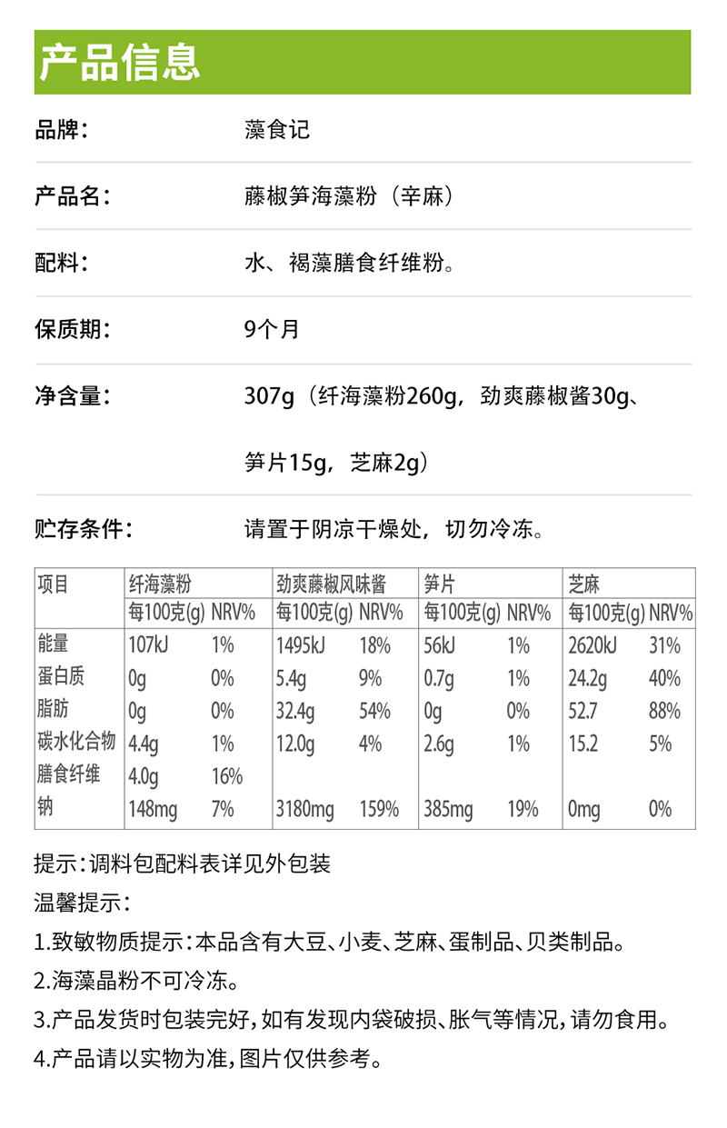 307g(纖海藻粉260g、勁爽藤椒醬30g、筍片15g、芝麻2g)